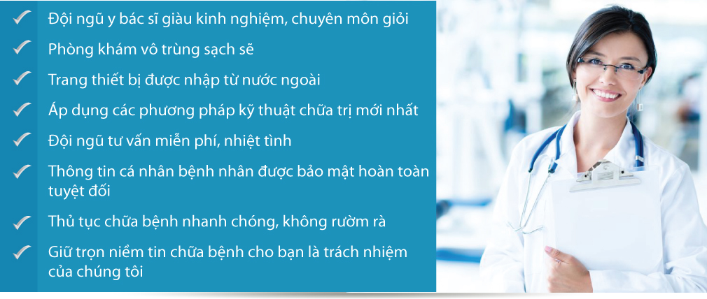 Chúng tôi không ngừng quy phạm hóa các thao tác và tiêu chuẩn tiểu phẫu, hình thành một hệ thống điều trị an toàn, hiệu quả, xây dựng thành phòng khám tên tuổi hàng đầu. Tôn trọng quyền riêng tư. Chúng tôi luôn đảm bảo tôn trọng quyền riêng tư của người bệnh, giúp cho bệnh nhân có thể yên tâm điều trị, tuyệt đối không tiết lộ thông tin gây những tình huống ái ngại.
