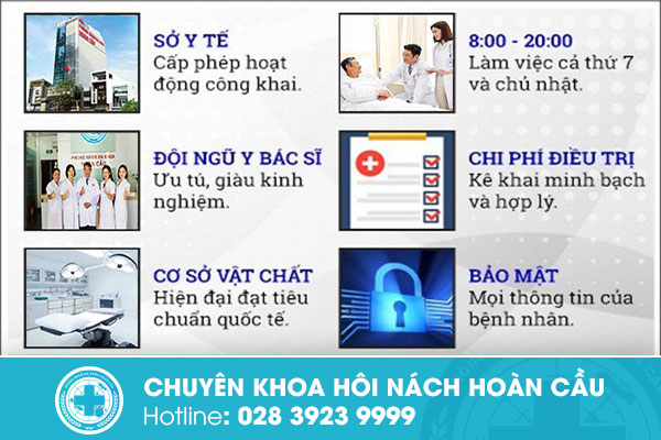Phòng Khám Đa Khoa Hoàn Cầu nằm tại số 80-82 Châu Văn Liêm, P.11, Q.5, TP.HCM, với trên 10 năm kinh nghiệm trong lĩnh vực y tế, với nhiều chuyên khoa điều trị. Chuyên khoa hôi nách được thành lập trên cơ sở nhu cầu khám và chữa bệnh hôi nách của người dân tăng nhanh. Yêu cầu về hiệu quả điều trị và chất lượng dịch vụ của bệnh nhân cũng nâng cao và nhiều tiêu chuẩn được đặt ra hơn. Hoàn Cầu ra đời như một giải pháp mới để cho bệnh nhân có cơ hội nhận được những điều kiện chăm sóc sức khỏe tốt nhất và hiện đại nhất.